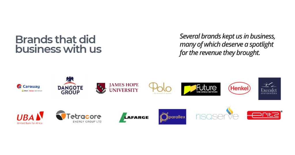 Caraway, Parallax Bank, Dangote Group, Tetracore, Lafarge, Polo Luxury, Henkel, Risqserve Africa Projects Ltd, Future One African Network, Execujet Aviation, UBA, James Hope University, and Eritz.