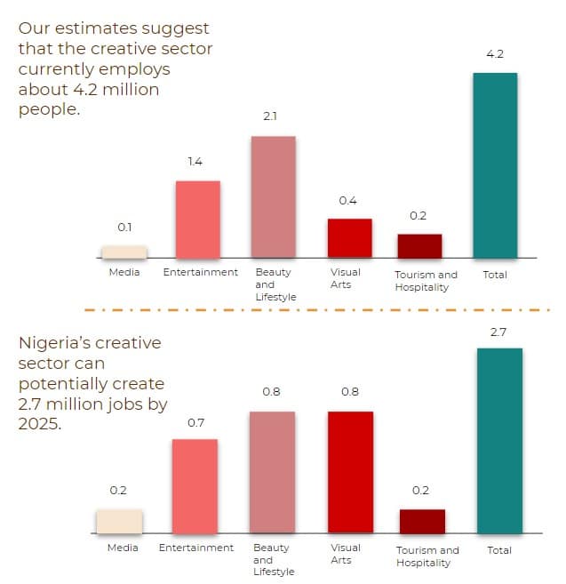 The good news is that the creative sector holds the potential to create jobs for young people. Our estimates suggest that the creative sector currently employs about 4.2 million people across five industries including Media, Entertainment. Beauty and Lifestyle, Visual Arts, as well as Tourism and Hospitality. Our projections also suggest that the creative sector can potentially create an additional 2.7 million jobs in the next 4-5 years.