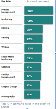From our findings across the 5 creative industries, we found skills gaps in areas such as cinematography and videography, project management, marketing, customer service, graphic design and sewing. There is also a significant demand gap in roles such as project management, marketing, editing, sewing, writing and social media marketing.